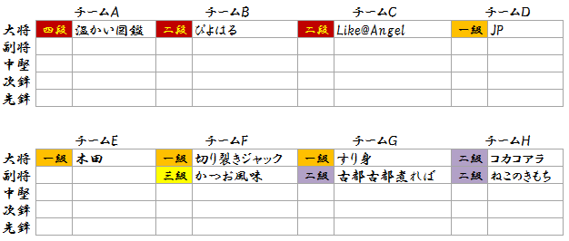■募集 先着40名様 ■大会形式 1チーム5人×8チームによるチームトーナメント戦 大将vs大将・・・先鋒vs先鋒 各5対戦を1vs1で。 チームとして3本取った方の勝ち。 ■チーム決め 参加40人を辻喜利の段位表を基に段位の上の人から 順番に一人ずつA〜Hの8チームに振り分けていく。 チーム内の一番段位が高い人が大将となり 一番段位が低い人が先鋒となる。 初参加の人は十級より下の順番で振り分けられます。 例えばこんな感じ ![]() ■投稿・投票 投稿する場所は辻喜利とは違いこちらで指定します。 特に何時から投稿、何時から投票と決めません。 二人の投稿が済み次第、投票に移り 投票が7人埋まり次第、結果開票となります。 人によって投稿する時間が違いますので 大会が終わるまで数日間かかる見込みですが 出来るだけ経過の確認を行って下さい。 なかなか投稿出来ない人もいると思いますので 皆さん気長に待って下さいね。 投票は辻喜利と同じで7人までです。 自チームの対戦(5試合分)には投票しなくて良いです。 間違えて投票してしまった場合はそれでも構いません。 相手チームに票を入れてしまった場合は嘆いて下さいw 敗退した後も投票へのご協力をお願いします。 ■運営上の流れ 参加登録40人埋まり次第、チーム編成、投稿開始と移ります。 数日間にも及ぶと思われますので 管理人が更新出来ない時間帯もあります。 その場合はしばらくお待ち下さい。 ■経過のご案内 このCGI上で総合案内所を設けますので 経過の確認等は案内所で行って下さい。 ツイッターでも随時報告します。 |