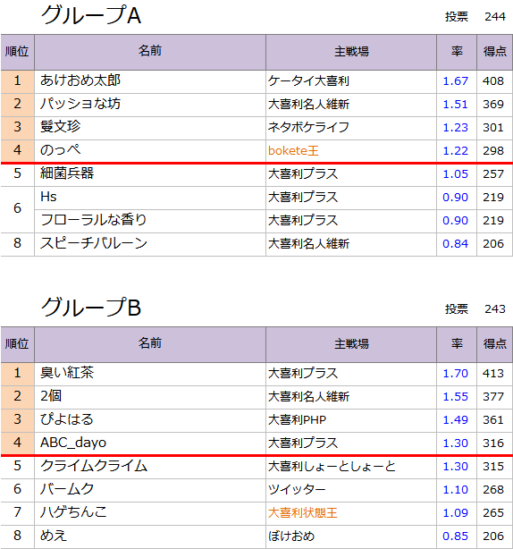 | 4 | ABC_dayo | 大喜利プラス | 1.30 | 316 | |||