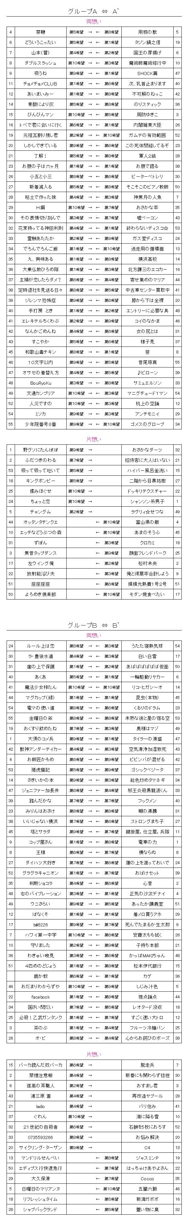 | 27 | 新着滅入る | 第5希望 | → | ← | 第8希望 | そこそこのピアノ教師 | 50 | ||